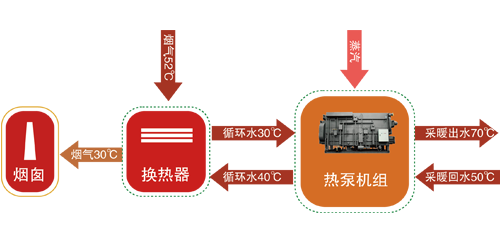 天然气经燃气锅炉燃烧后,产生的烟气,进入烟气余热深度回收机组,深度回收烟气中的热量使排烟温度大幅度降低,回收的热量用于加热热网回水或直接供热。 | 燃煤锅炉燃烧产生的烟气经湿法脱硫后进入换热器,深度回收烟气中的潜热与显热并降低污染物的排放,使锅炉的排烟温度大幅降低,回收的热量用于加热热网回水或直供。 | |