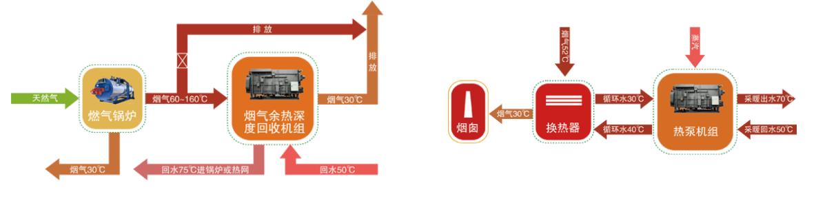 采用独创的喷淋式换热技术和热泵技术相结合,深度回收烟气(燃气电厂或燃气锅炉)中的余热,将排烟温度降至30℃以下,回收的热量通过热泵提升,加热热网回水,可将天然气利用率提高10%以上,消除烟气中的粉尘及冒“白烟”现象。